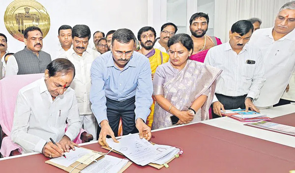 కాంట్రాక్టు ఉద్యోగులను క్రమబద్ధీకరించే ఫైల్పై సంతకం చేస్తున్న ముఖ్యమంత్రి కేసీఆర్. చిత్రంలో మంత్రులు హరీశ్రావు, వేముల ప్రశాంత్రెడ్డి, సీఎస్ శాంతికుమారి, ప్రత్యేక కార్యదర్శి పీ రాజశేఖర్రెడ్డి, కార్యదర్శి భూపాల్రెడ్డి తదితరులు