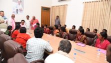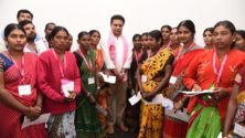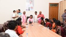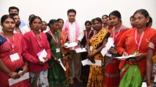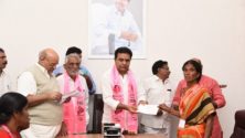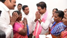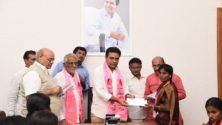 TRS working president KTR handing over cheques to the family members of the deceased party workers