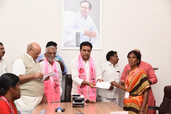 TRS working president KTR handing over cheques to the family members of the deceased party workers
